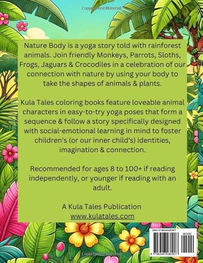 Nature Body is a yoga story told with rainforest animals. Join friendly Monkeys, Parrots, Sloths, Frogs, Jaguars and Crocodiles in a celebration of our connection with nature by using your body to take the shapes of animals and plants. Recommended for ages 8 to 100+ if reading independently, or younger if reading with an adult.